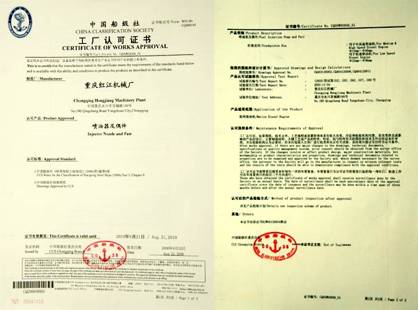 中國(guó)船級(jí)社認(rèn)可證書(shū)——噴油器及偶件